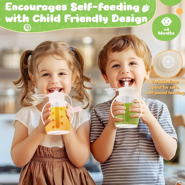 【Encourage Self-feeding】Each reusable baby pouche for toddlers and babies includes a variable flow opening for safe, self-paced feeding. The soft silicone spout is gentle on mouths, easing the transition to solids. The puree squeeze pouch comes with two handles for the baby's little hands to have a stable grip. It features a convenient squeeze design, making feeding time fun and mess-free.