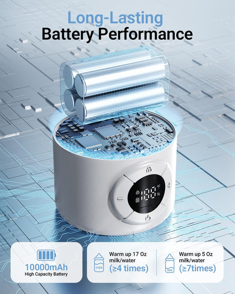 10000mAh battery fully charges in 2 hours (80% in 1.5h). Supports up to 7 heating cycles of 5oz water/milk from 77°F to 104°F on a full charge.
