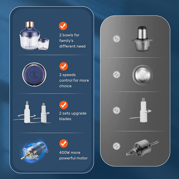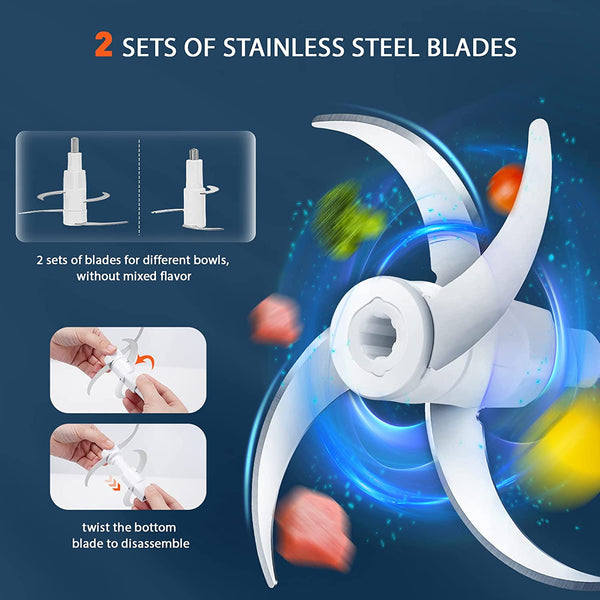 • Better Performance: Powerful 400w motor and stainless steel blades allow you to chop, blend, puree, mix, and mince a variety of ingredients more quicker. The 4 blades design of the upper and lower layers also allows the food to be cut more evenly