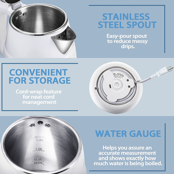 ☕【COMPACT AND DELICATE】 This kettle water boiler can boil up to 1.5 liters of water, which is equivalent to 6 cups of 250ml water, making it perfect for family use. It's the perfect kettle for any kitchen. Bottom with a cord wrap design for Convenience for storage.