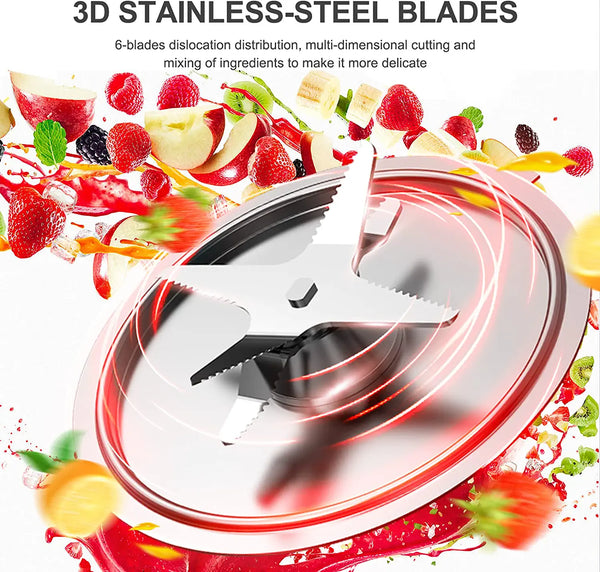 6 sharp blades arranged in three layers (upper, middle, lower) for multi-dimensional blending—easily handles ice, frozen fruits, and tough ingredients.